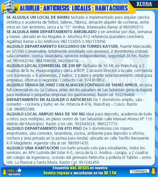 Anuncios clasificados, compra, venta, alquiler, anticresis de casas, departamentos, terrenos, oficinas,  locales comerciales y mucho más así como traspaso de oficinas, tiendas, locales comerciales y todo los avisos inmobiliarios y económicos del Cusco.