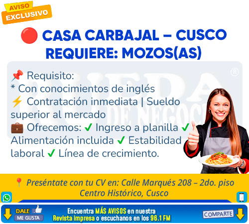 Anuncios clasificados, empleos en Cusco, oportunidades de trabajo, cocineros, chefs, mozos, asesores de venta, administradores, médicos, abogados, contadores, ingenieros, auxiliares de contabilidad, conductores, choferes ayudantes de cocina, señoritas y jóvenes para ventas y mucho más.