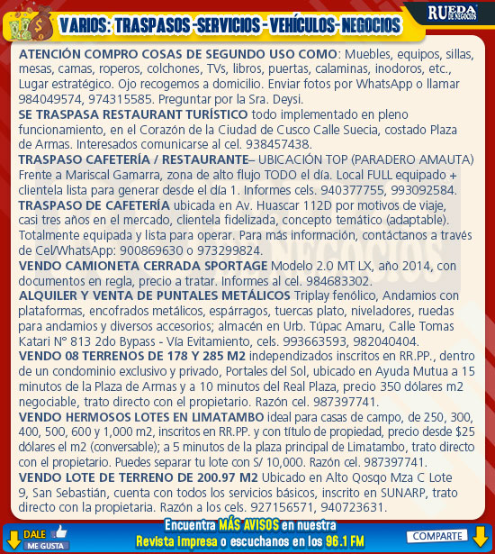 Anuncios clasificados, oportunidades de empleos y trabajo en toda la región del Cusco, compra, venta, alquiler, anticresis de casas, departamentos, terrenos, oficinas, etc. venta y compra de muebles, maquinas, vehículos, traspaso de locales comerciales, oficinas, tiendas y todo los anuncios de negocios.